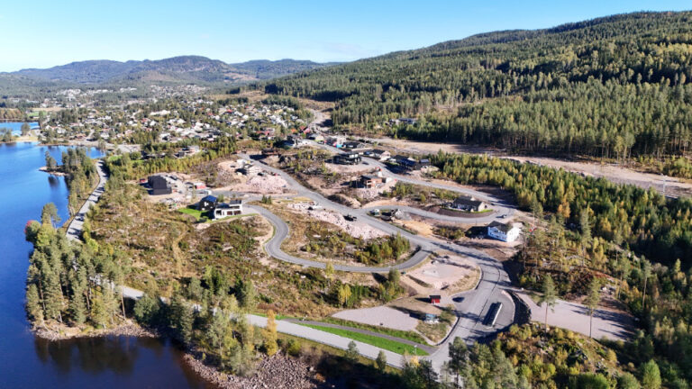 Boligfeltet begynner virkelig å ta form, og mange nye hus har kommet opp den siste tiden på Harestua. Per i dag er tre av fem rekkehus solgt, og det er fortsatt to igjen for de som drømmer om et moderne hjem i naturskjønne omgivelser. Vi fikk komme inn og ta en nærmere titt under byggeprossessen. For en utsikt ut mot vannet inne i rekkehuset!