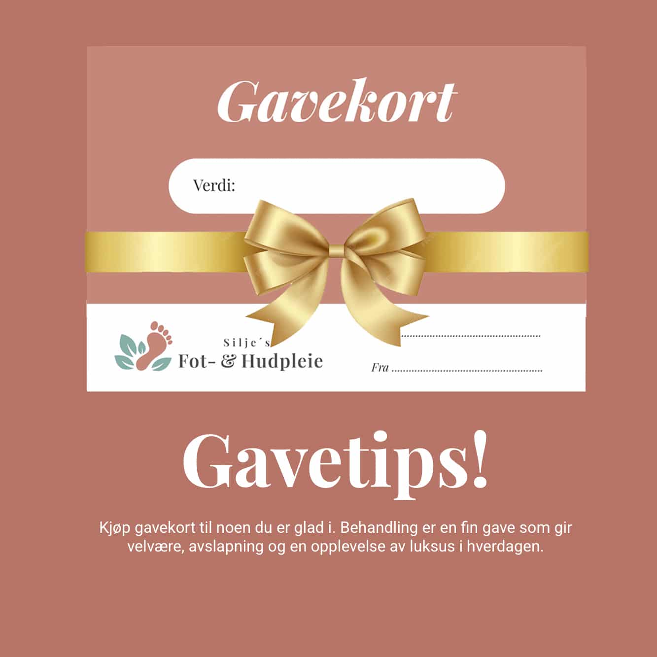 Silje´s Fot- og Hudpleie AS Vannebos veg 211,HarestuaHos Siljes Fot og Hudpleie kan du kjøpe gavekort til noen du er glad i. Rn behandling hos Silje er veldig fin gave som gir velvære, avslapning og en deilig følelse av luksus i hverdagen. Kjøp her!